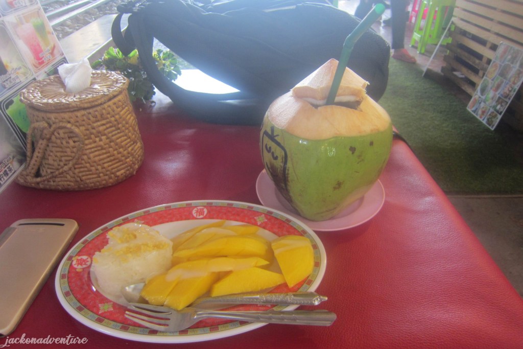 There are some food stalls set up at Maeklong Station. They have Pad Thai, curry tom yam, seafood, and fresh fruits. The price is really cheap here. I had mango sticky rice and coconut water. It has great taste and cost only 90 Baht!