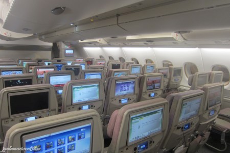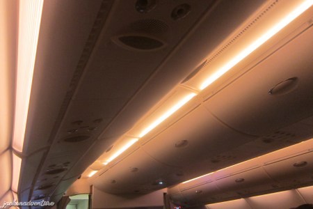 When I entered the upper deck of the plane, I was amazed by how grand the plane was in its interior design. The good news was that my selected window seat was spacious, for Economy Class with bigger legroom compared to 747 and got only 2 seats on the window side.