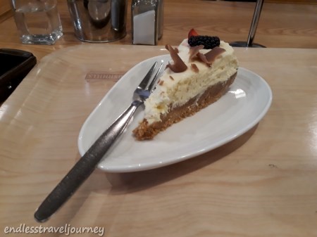 I had the crispy chicken tender served with fresh salad and potato wedges and Whiskey cheesecake for dessert. Yup, feeling so hungry and greedy too.
