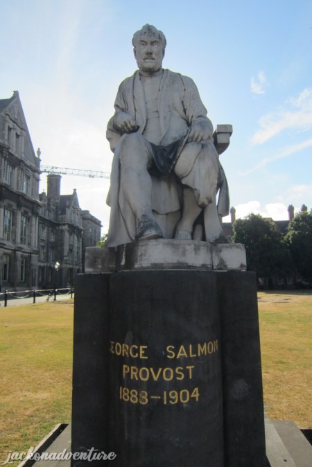 A few steps ahead is the statue of Prof George Salmon, an influential Irish mathematician and Anglican theologian. He spent his entire career at this college and made a commitment by strongly oppose women receiving degrees from this college. Just after his passing, the first female undergraduates were admitted in 1904.