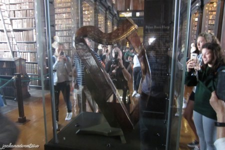 The Brian Boru harp located near the exit of The Old Library is the oldest to survive from Ireland and it is believed to date back to the 15th century. It was made from oak and willow with brass strings. The harp’s symbol can be found in current Irish coins.