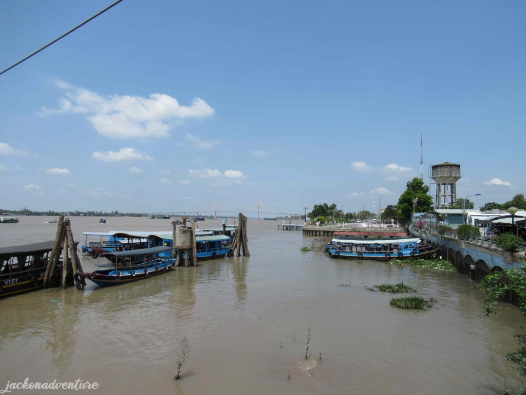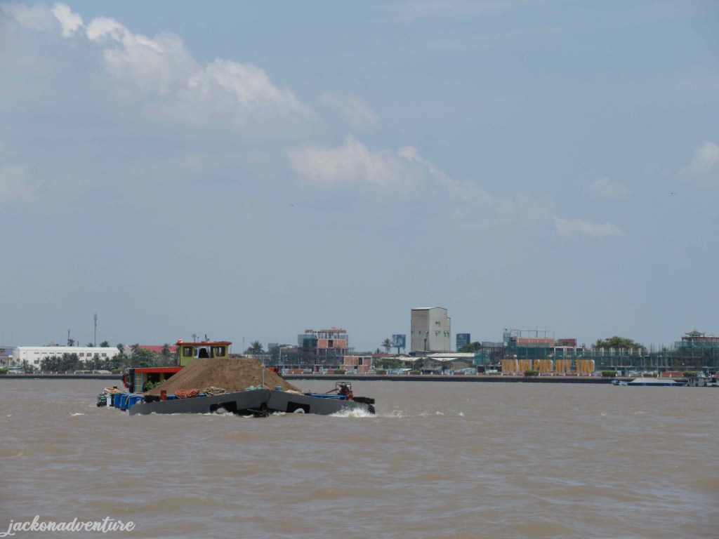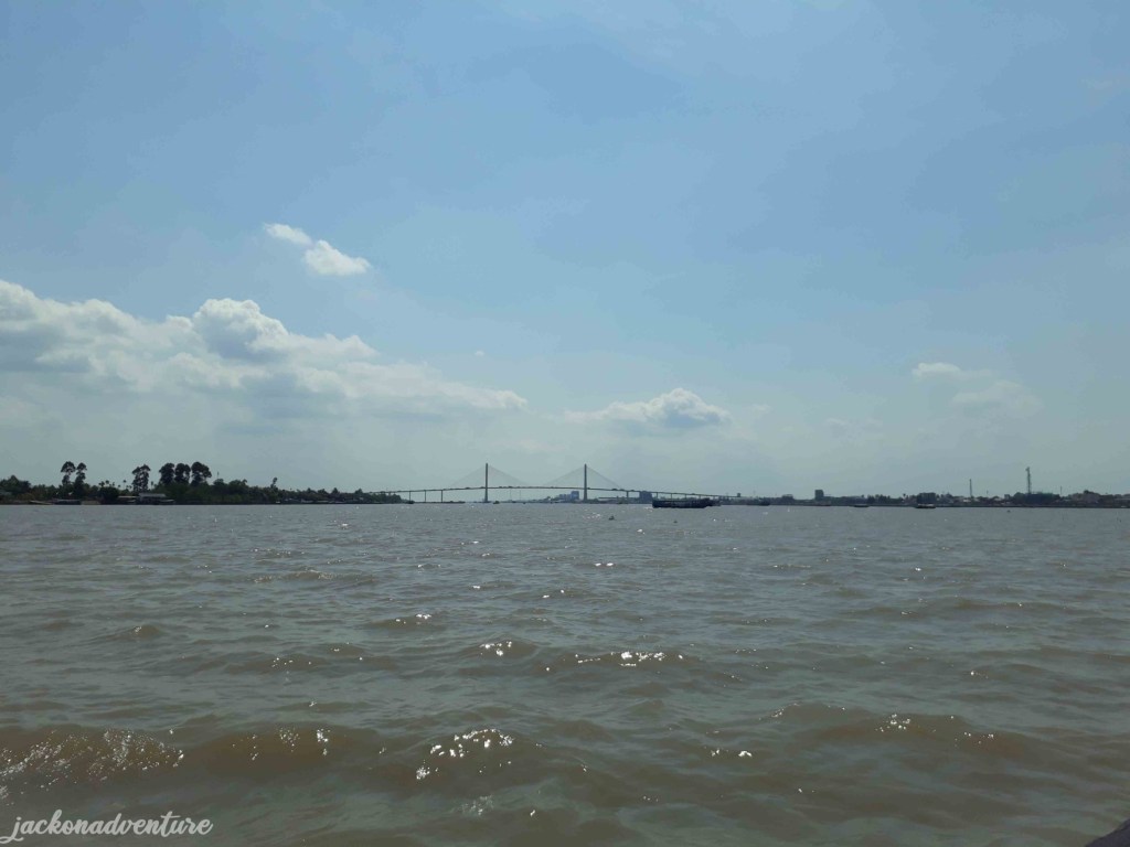 When we finished our delicious lunch, we went back to the mainland of My Tho. It seems to get busier during noon with many boats moving along the river. These boats are used to transport sand, construction materials, vegetables, fresh fruits, and passengers in the Mekong Delta. Mỹ Thuận Bridge, a cable-stay bridge was built and completed in 2000 to connect Cai Be district of Tiền Giang province with Vinh Long city.