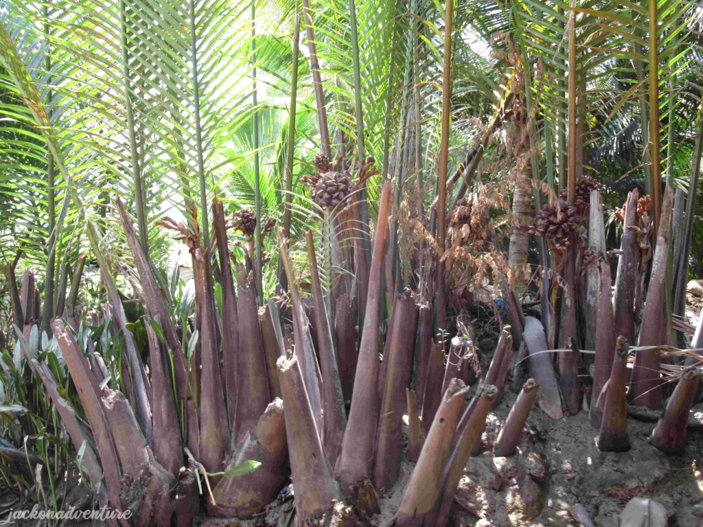 This is the most exciting part of our tour, getting into a tiny rowing sampan, each can fit up to four passengers. So, we were divided into small groups, being seated one behind the other as the two helmsmen took us on a 20-minute ride. There are plenty of water coconut palms grown on both sides of this small river.