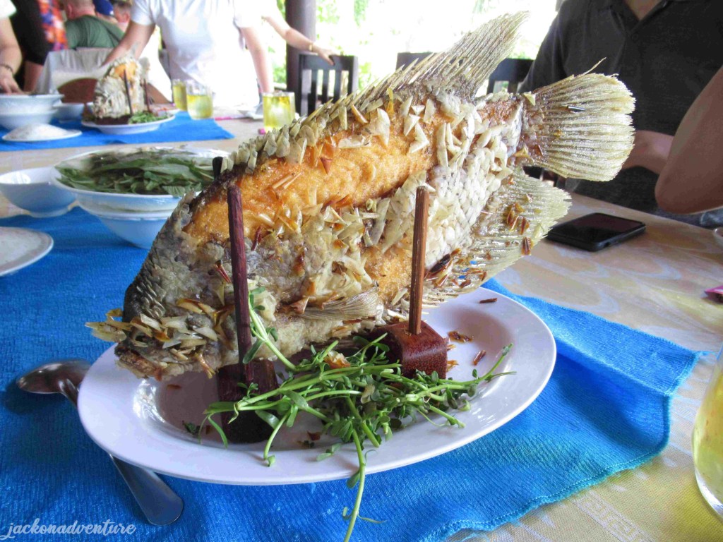 We returned to our motorboat and went to Phoenix Island for lunch. Luckily, the food was well prepared minutes after our arrival because most of us were hungry. We have a delicious Vietnamese meal while admiring the riverside scenery.