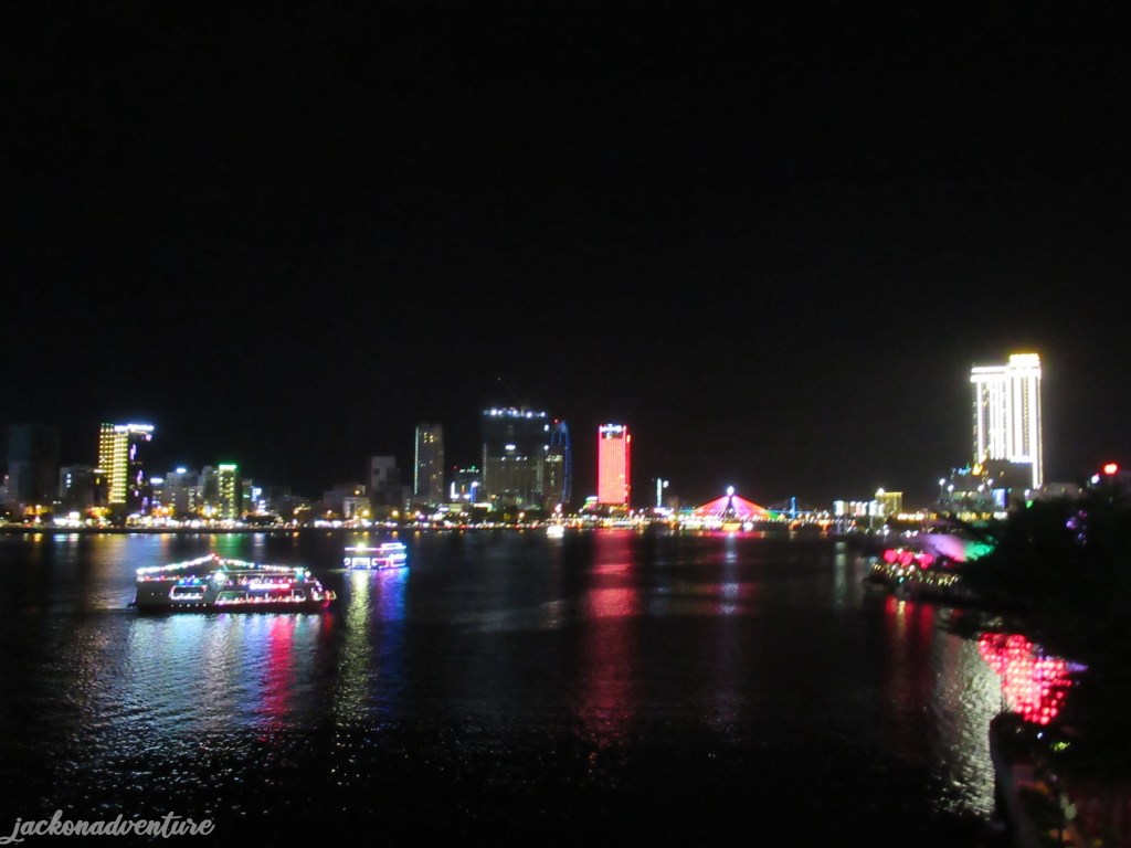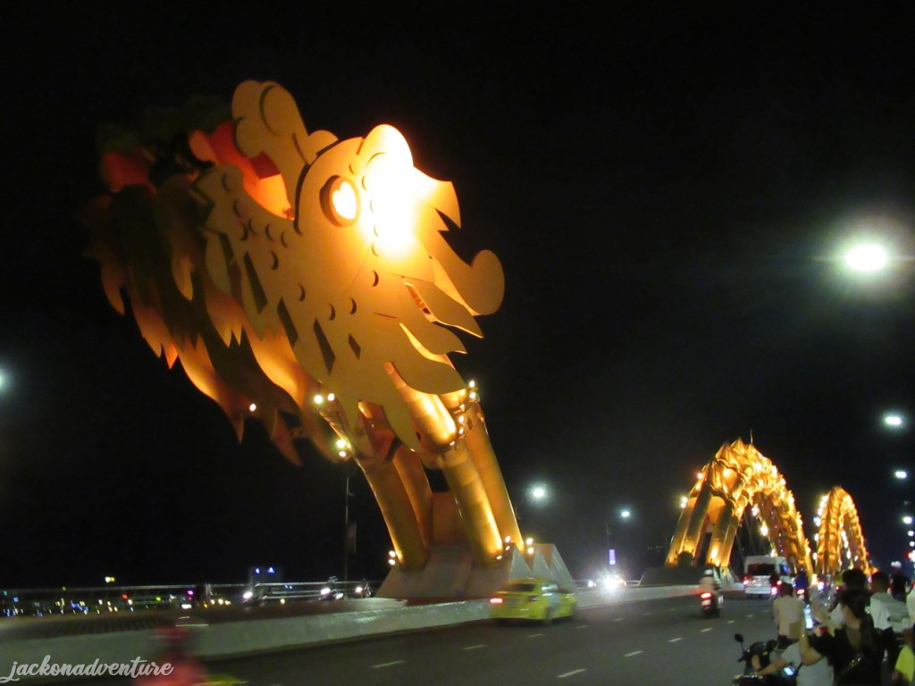 Cross the 666-meter-long Dragon Bridge to watch the night lights of Han River Bridge, Cầu Trần Thị Lý bridge and the surrounding buildings along the riverside. The bridge was opened on March 29, 2013 to mark the 38th anniversary of the taking of Danang by the North Vietnamese near the end of Vietnam War.