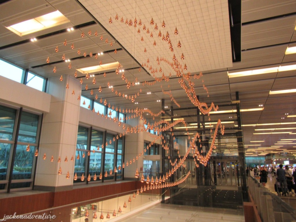 Catch the amazing Kinetic Rain formed by 1,216 bronze droplets. Located near the fast check-in counters in the public area. Each sculpture creates 16 different shapes of abstracts including an airplane, hot air balloon and dragon.