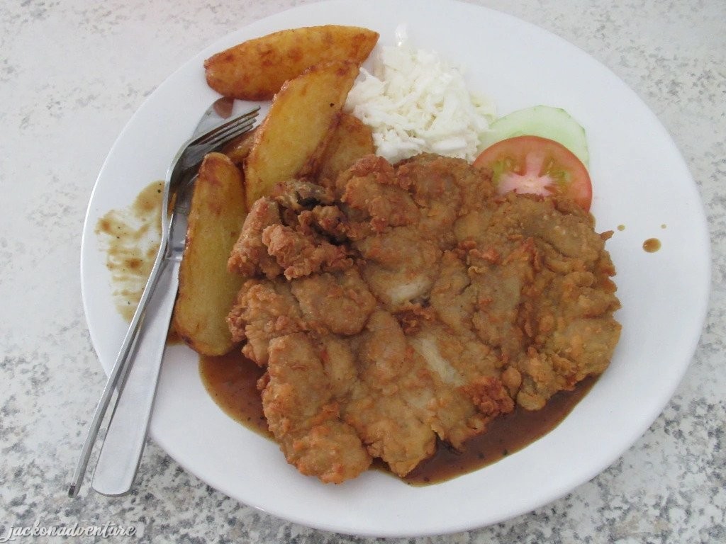 Located along Jalan Dhoby, IT Roo Cafe is another cafe that serves authentic Hainanese chicken chop. The chicken is heavily battered with biscuit crumbs and fried to a golden brown crisp outside. It was dressed with mushroom sauce and came with fried potato wedges and coleslaw. The boneless chicken was tender and moist.