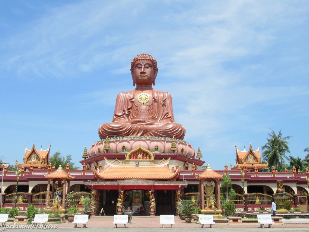 The sitting Buddha statue is one of the largest in Southeast Asia with a height of 30 meters and a width of 47 meters. The statue took more than 10 years to construct and used hundreds of skilled craftsmen from Thailand. It is coated with tiny shiny mosaic tiles and the bottom lip is coated with gold.