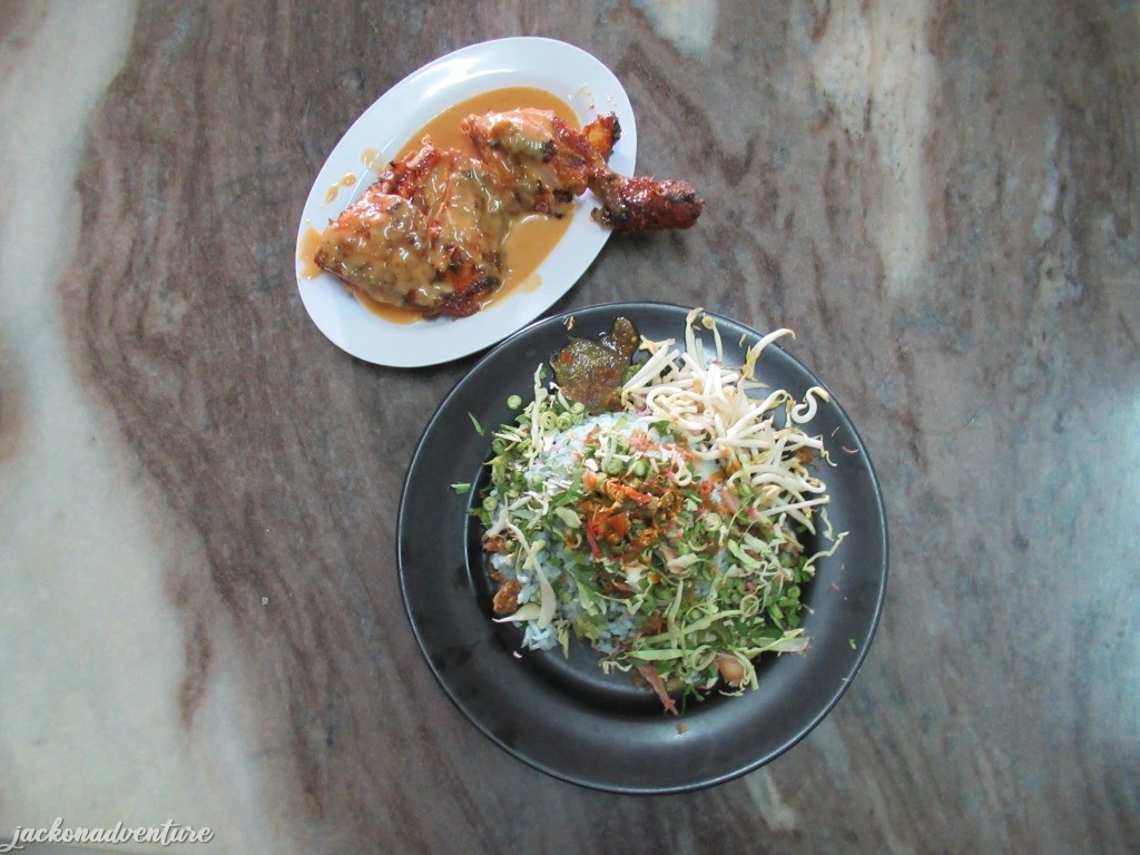 I tried their signature dish, Ayam Percik (roasted spiced chicken) and Nasi Kerabu. The chicken is first prepared in an open-air grilling area with charcoal and later topped with creamy, sweet-spicy sauce. The rice is prepared through the extraction of butterfly pea flower (telang) which creates a blue-hue color and is served together with herbs, bean sprouts, fried coconut paste, ginger flower and chopped basil leaves. The rice, chicken and a glass of ice lemon tea cost RM14, which is quite a decent price for me.