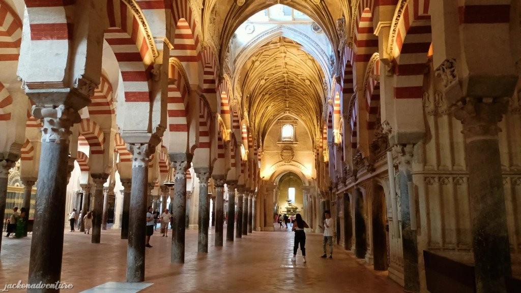 The Great Hall inside the complex consists of 856 arches and columns painted with red and white stripes. It was constructed with marble, onyx, jasper and granite carved from pieces of the Roman temple and buildings that once stood here.