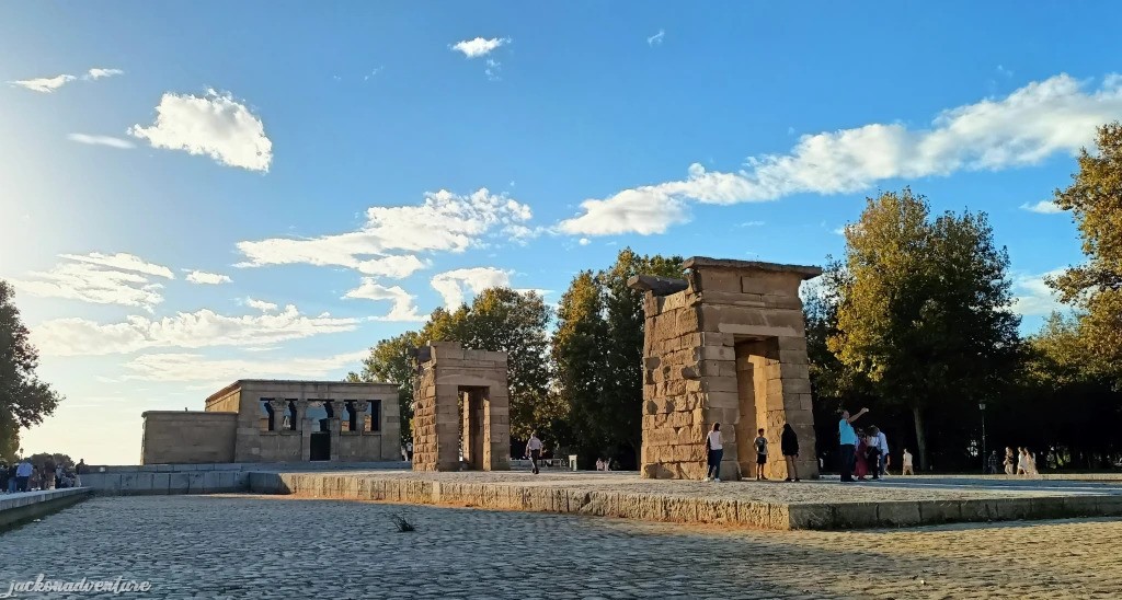 The Temple of Debod is an ancient temple given to Spain by the Egyptian government as a sign of gratitude for saving the Abu Simbel temple from floods following the construction of the Aswan Dam in 1968. The temple was dismantled and reconstructed in the Parque del Oeste near the Royal Palace and later opened for the public in 1972.