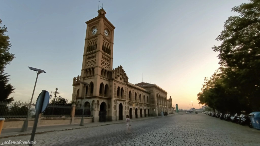 The station was rebuilt in 1919 with brick and stone. Its plasterwork was done by Ángel Pedraza, woodwork by Cristino Soravilla, tiles from Seville’s Casa Mensaque and iron forged by Julio Pascual. There is a small chapel near the arrival gate and four clocks attached on each side of the top of the tower.