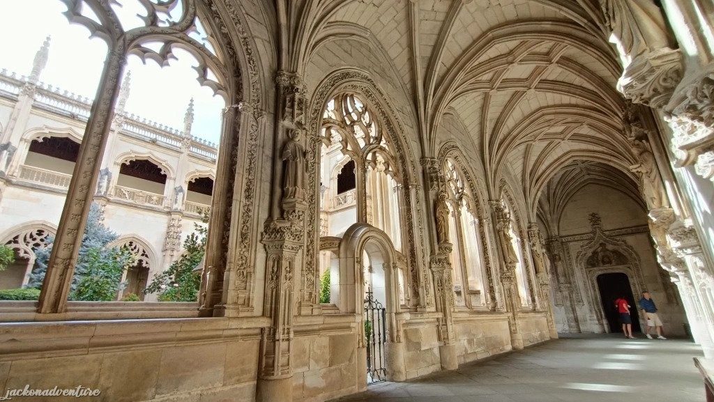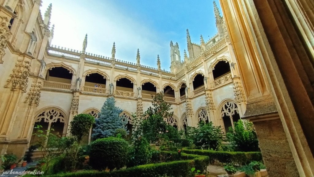 The two-level cloister is surrounded by beautiful gardens. The lower level ceiling consists of German cross vaults, carved in stones with figures of saints, plants, animals and mystical motifs. The upper floor reveals a harmonious four-sided space with rich mixed-style arches and a ceiling painted with allegorical symbols of the Catholic Monarchs.