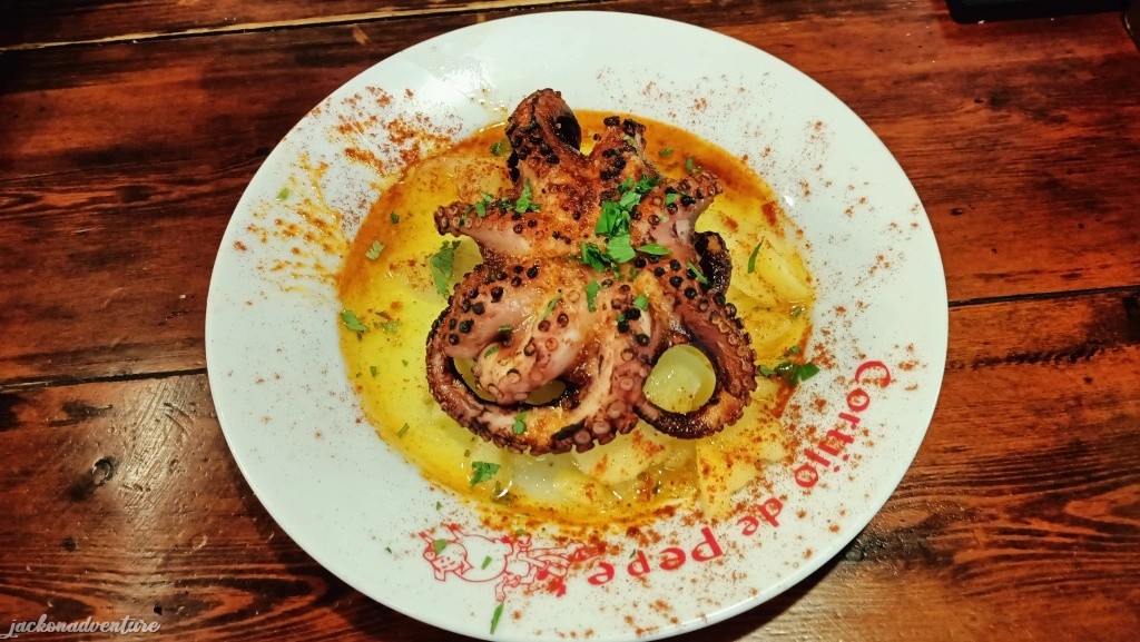 The way of cooking the octopus is by grilling it using charcoal. It originated in the northwestern region of Galicia when octopus is the specialty and a common catch for local fishermen. The juicy grilled octopus will be added with olive oil, sprinkled with sweet paprika and served with slices of potatoes