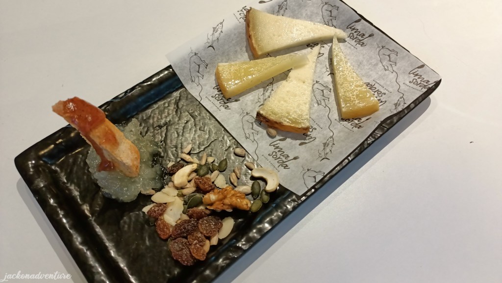 The cheese mix is served with exceptionally high-quality Payoya goat cheese and sheep cheese. It comes with a little side of sweet roasted ground nuts.
