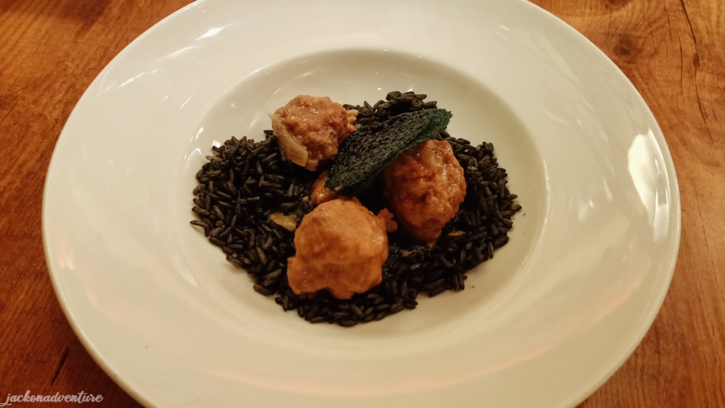 Spanish: Albondigas de Choco y Gambas con Arroz Negro (Tapa or dish)