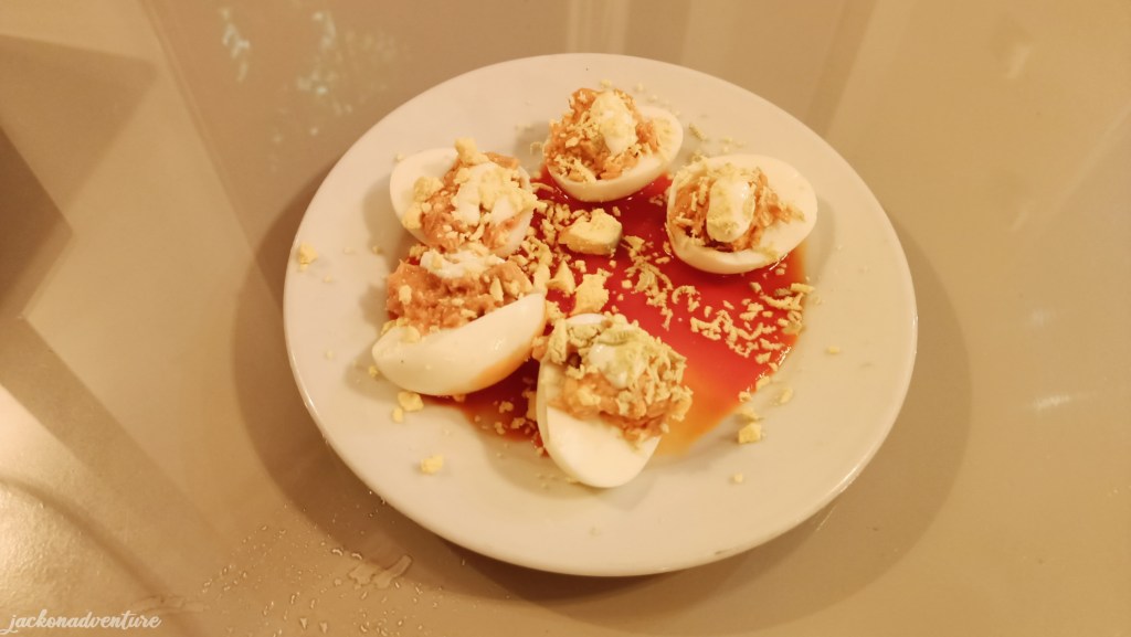 This classic deviled egg is only made with two key ingredients- tuna and eggs. Its origin came from Andalusia and the recipe went through several changes, mostly because mayonnaise wasn’t used in the past. Back then, it was made with a similar sauce called “Murri”, a fermented fish of what the present-day recipe for tuna.