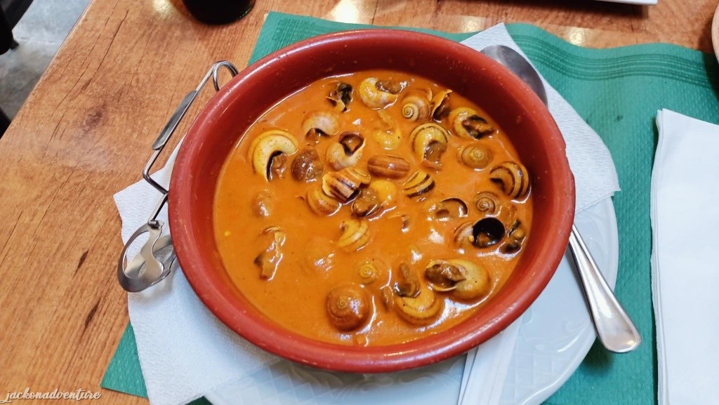 Originated from Andalusia, this snail in sauce is made with a combination of snails and a rich sauce consists of tomatoes, garlic, parsley, salt, pepper, white wine and brandy.