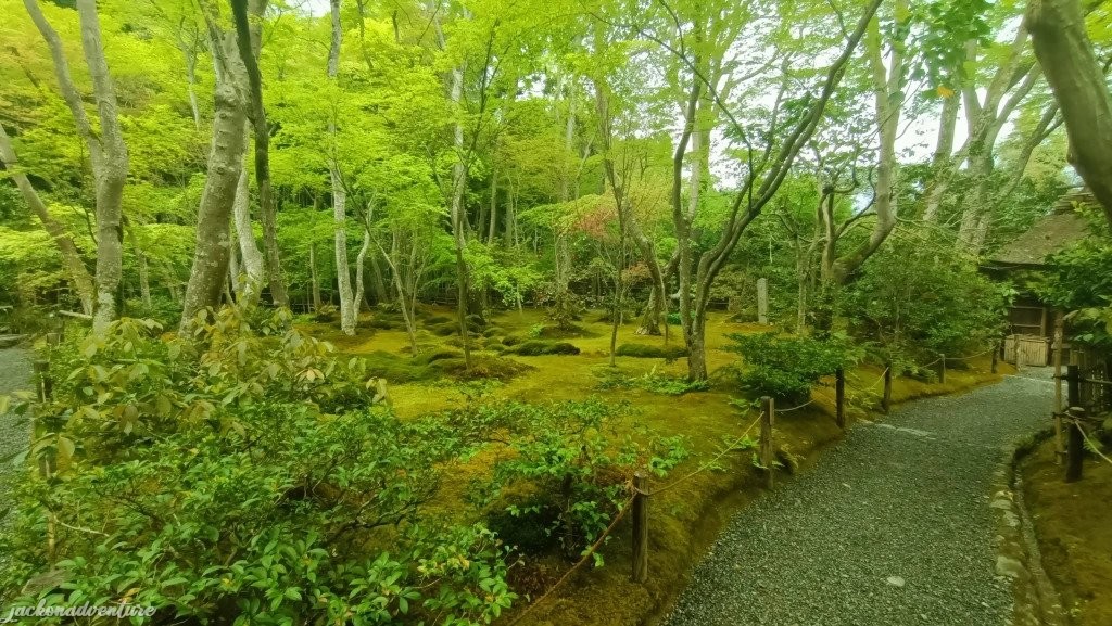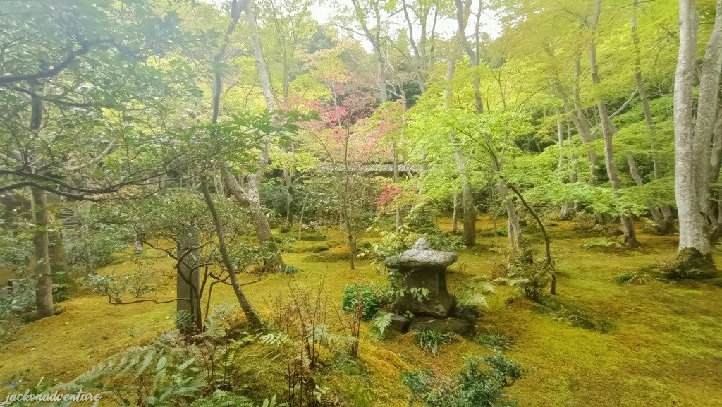 The thick moss covers the site in green and is surrounded by tall bamboo grove and maple trees.