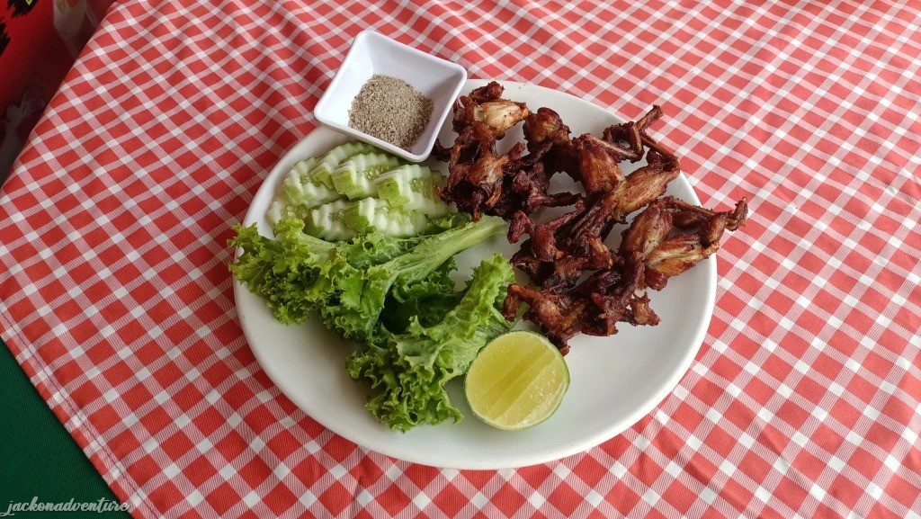 After a long walk at Kulen National Park, it’s time to give the tired legs a break. Fortunately, as part of my small group tour, we have a perfect spot under a hut to have a picnic while enjoying the view of Kulen Waterfall. My guide prepares a delicious Khmer chicken with jasmine rice and fresh fruits.