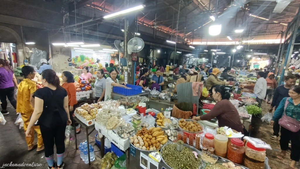 The market offers you the chance to sample some Cambodian food such as Khmer noodles, soup, rice dishes, baguettes, spiced frogs and pork sausages at an affordable price. If you’re here for breakfast, try their traditional bai sach chrouk comprised of juicy pork slices, scrambled eggs and broken rice.