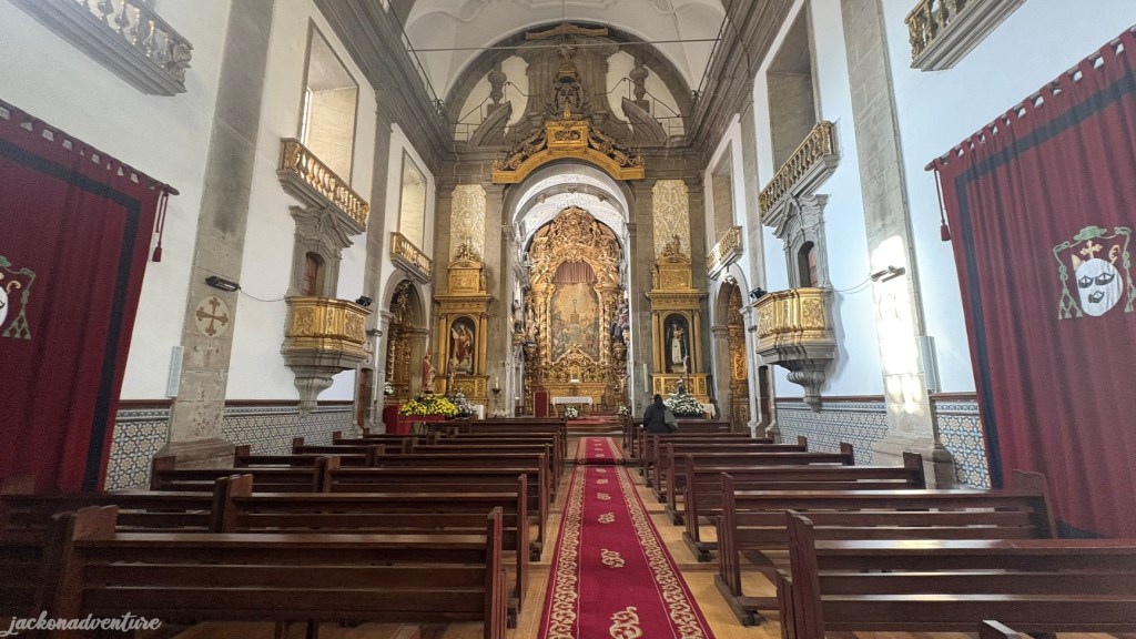 Inside the Roman Catholic church, you can see opulent gilded woodcarvings, an altar with intricately carved pews and large pillars supporting a high ceiling. The beautiful blue and white azulejo tiles illustrate various religious and cultural stories.
