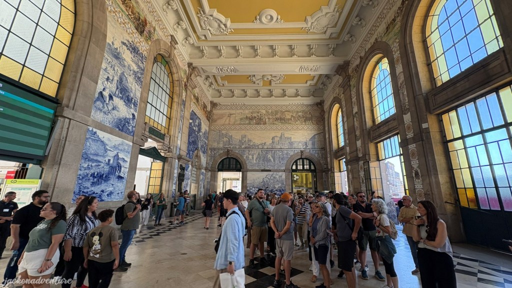 Admire the beautiful azulejo of SĆ£o Bento Station