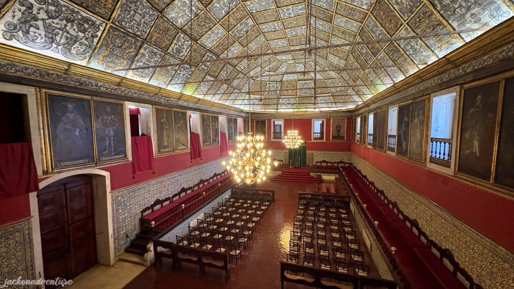 The Ceremonial Hall (Sala dos Capelos) was originally the Throne Room, and is currently where the Institution holds most of its official ceremonies, including the rector’s investiture ceremony. Oral exams are still conducted in this room. The room’s current design dates back to 1655 and is adorned with 17th-century portraits of all Portugal’s kings on its red velvet walls, except the dynasty of the Philips, when Spain ruled the country.