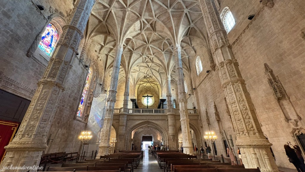 Right beside the monastery sits the beautiful Church of Santa Maria, a striking blend of Gothic and Renaissance styles. As you step inside, the vaulted ceiling—held up by slender, tree-like columns—immediately draws your eyes upward and creates an atmosphere that feels almost otherworldly. It houses the tombs of Vasco da Gama, Luís de Camões, the celebrated Portuguese poet and writer, and the 19th-century historian Alexandre Herculano.